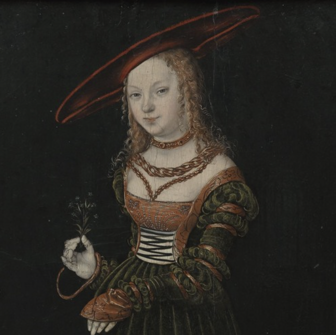 Próby ustalenia nazwiska tajemniczej piękności nie powiodły się. Przypuszczano, że portret przedstawiał księżniczkę Sybillę van Cleve. Samo określenie „księżniczka”, zapisane w niektórych inwentarzach, budzi jednak wiele wątpliwości. Cranach wielokrotnie malował strojne damy w podobnych kapeluszach, o zbliżonych rysach twarzy, w których powtarzał upodobany przez siebie kanon urody kobiecej. Jego pierwowzorem mogło być kilka modelek, pochodzących z różnych sfer społecznych, niekoniecznie arystokratycznych. Trzymana w ręku przez portretowaną gałązka niezapominajek może świadczyć o tym, że był to portret „narzeczeński”.