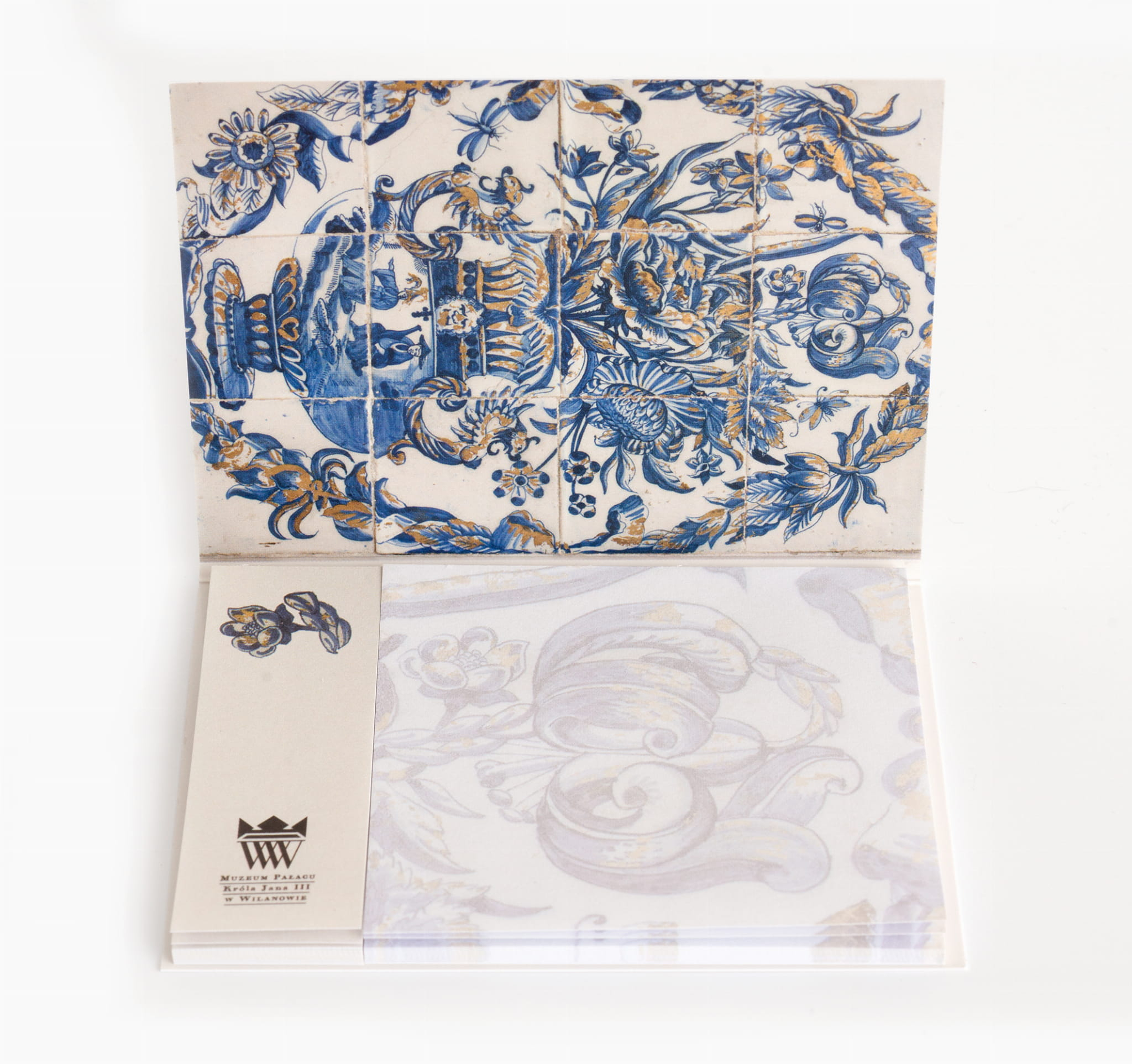 Karteczki samoprzylepne z motywami kwiatowymi przedstawionymi na kaflach fajansowych w Gabinecie Farfurowym.