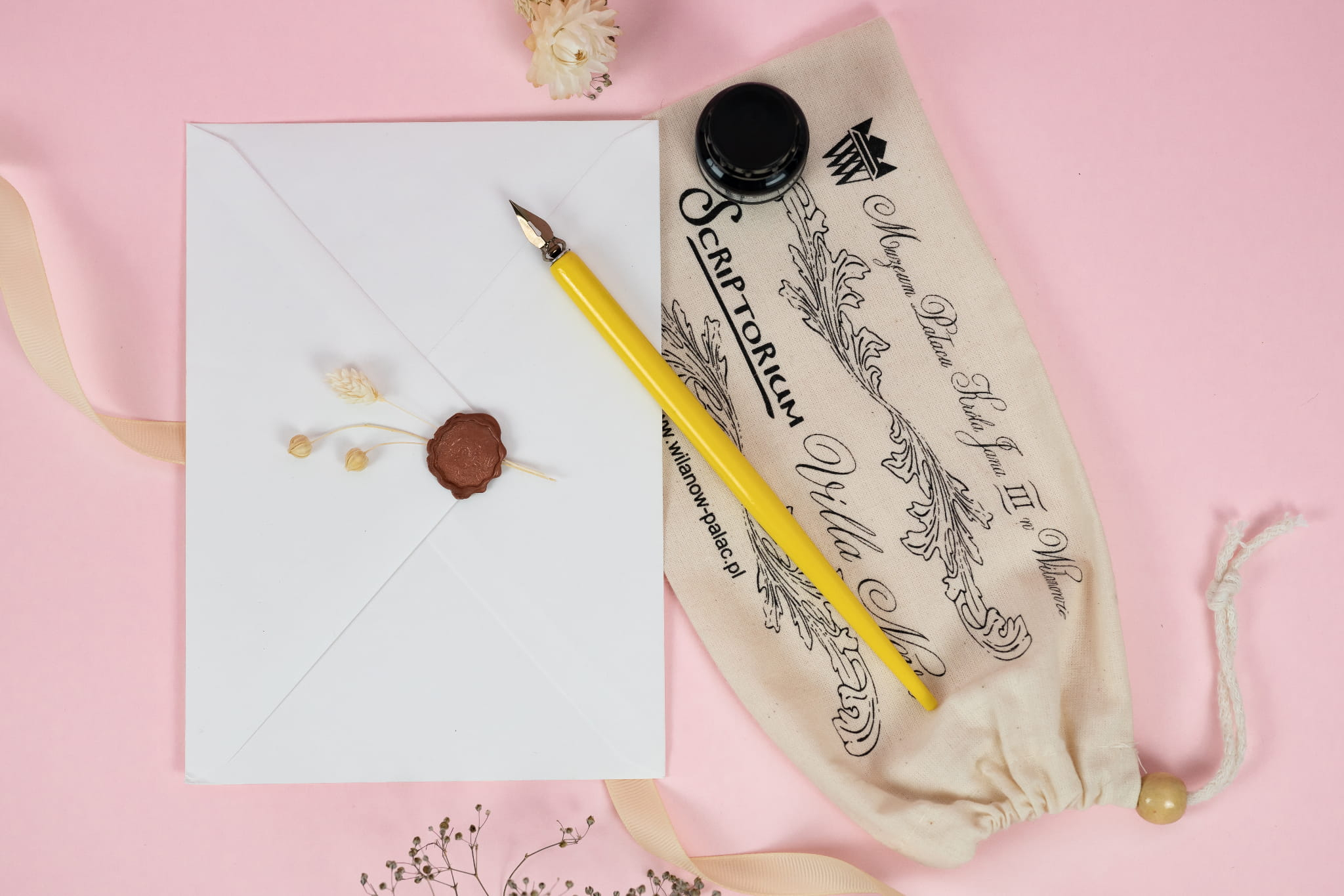 Przybornik kaligraficzny. W zestawie znajduje się czarny tusz, obsadka, stalówka i kartka papieru czerpanego. Wszystko w oryginalnym, wilanowskim woreczku.