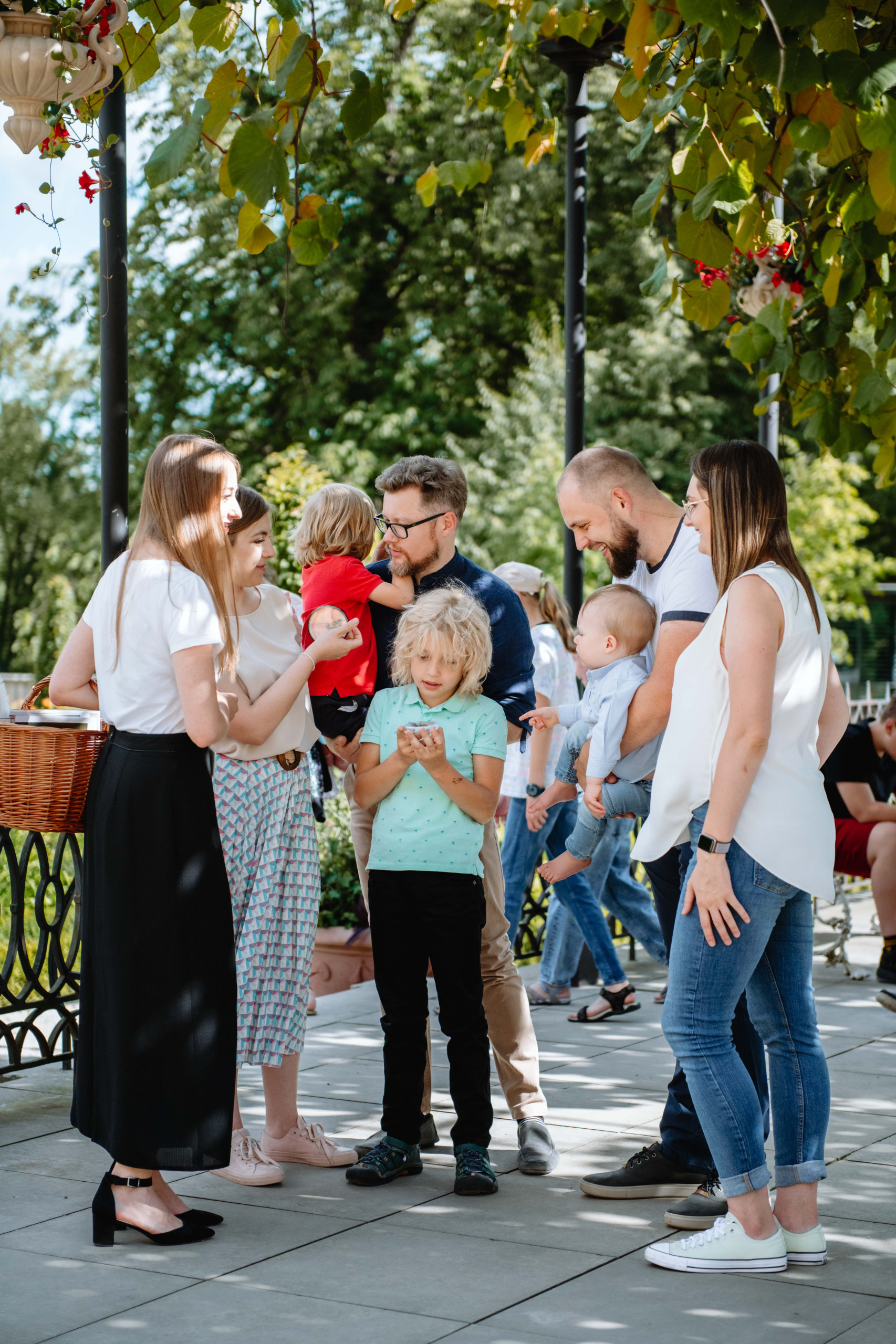 Kolorowe zdjęcie współczesne. Przedstawia grupę ludzi z dziećmi. Jest to spotkanie rodzin na tle pejzażu. Portretowani ubrani są w letnie stroje współczesne.